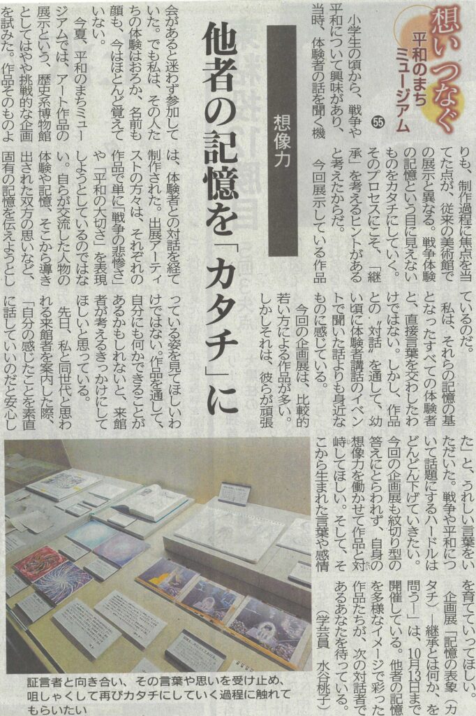 今夏、平和のまちミュージアムでは、アート作品の展示という、歴史系博物館としてはやや挑戦的な企画を試みた。作品そのものよりも、制作過程に焦点を当てた点が、従来の美術館での展示と異なる。戦争体験の記憶という目に見えないものをカタチにしていく。そのプロセスにこそ、「継承」を考えるヒントがあると考えたからだ。