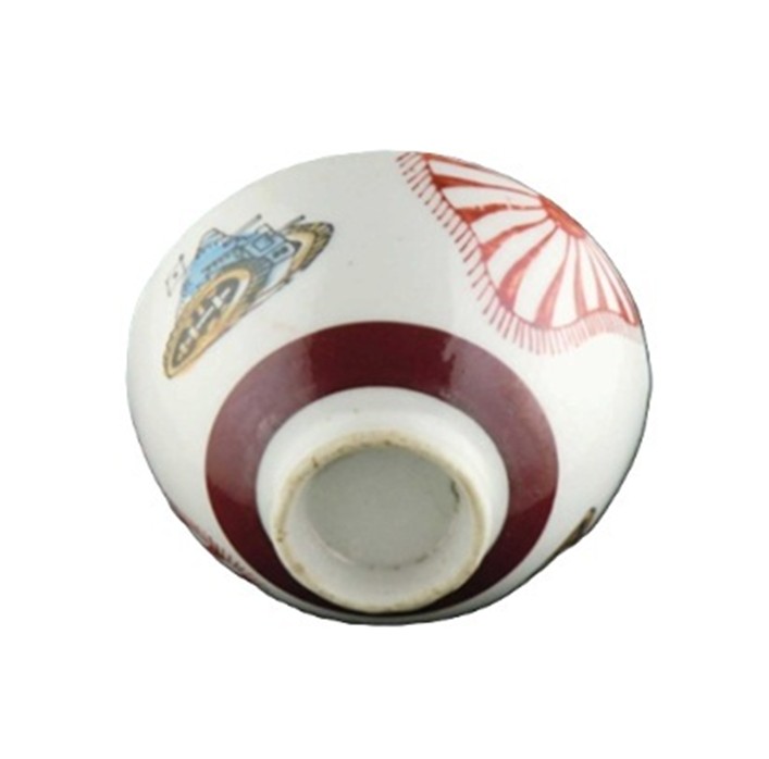 宮﨑コレクションは、子ども用の飯茶碗(以下、子ども茶碗)、子ども用の貯金箱、土人形、金属代用陶磁器、それらに関する紙資料など約300点からなる資料です。宮﨑さんは平成17(2005)年より、昭和初期~終戦の混乱期までに生産され、一般市民が使用した陶磁器製品の収集をはじめられました。骨董市で戦車と軍旗が描かれた子ども茶碗を見つけ、戦時体制が子どもの手のひらにもおよんでいたことに衝撃を受け、「この前後にどのような図案があるのだろう」と興味を持ったことが収集のきっかけだったそうです。