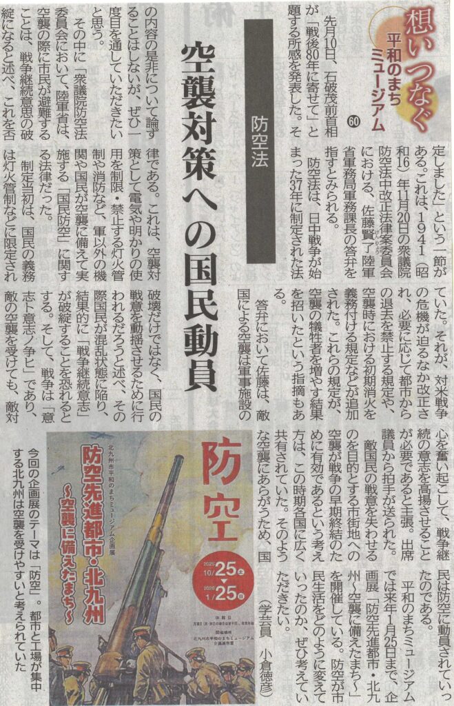 平和のまちミュージアムでは、来年1月25日まで、企画展「防空先進都市・北九州~空襲に備えたまち~」を開催している。防空が市民生活をどのように変えていったのか、ぜひ考えていただきたい。