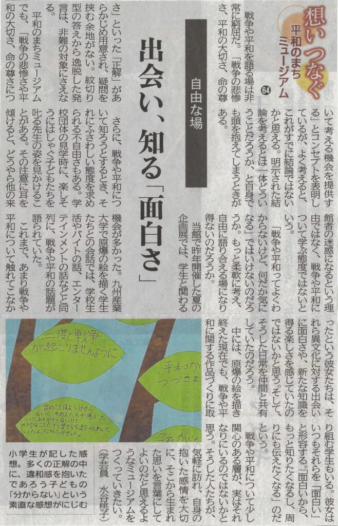 当館で昨年開催した夏の企画展では、学生と関わる機会が多かった。九州産業大学で原爆の絵を描く学生たちとの会話では、学校生活やバイトの話、エンターテインメントの話などと同列に、戦争や平和の話題が語られていた。